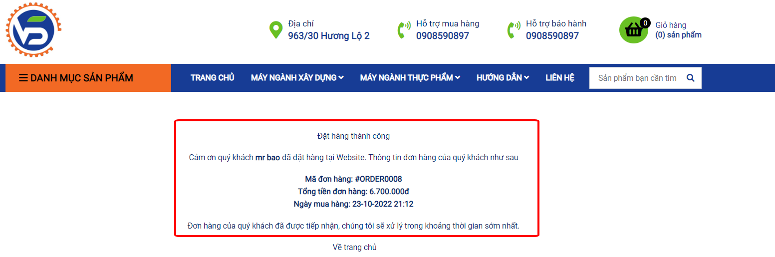 - Sau khi hoàn thành điền thông tin, bạn nhấn nút ĐẶT MUA, thông tin đơn hàng sẽ tự động hiển thị trên website của thietbivisat.vn để thông báo cho bạn về việc chúng tôi đã tiếp nhận đơn hàng. Nhân viên kinh doanh sẽ nhanh chóng liên hệ với bạn để xác nhận và xử lý đơn hàng.